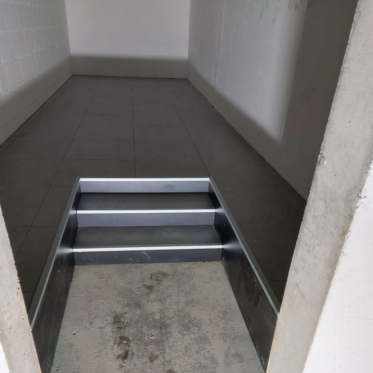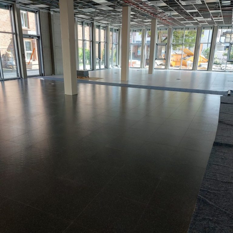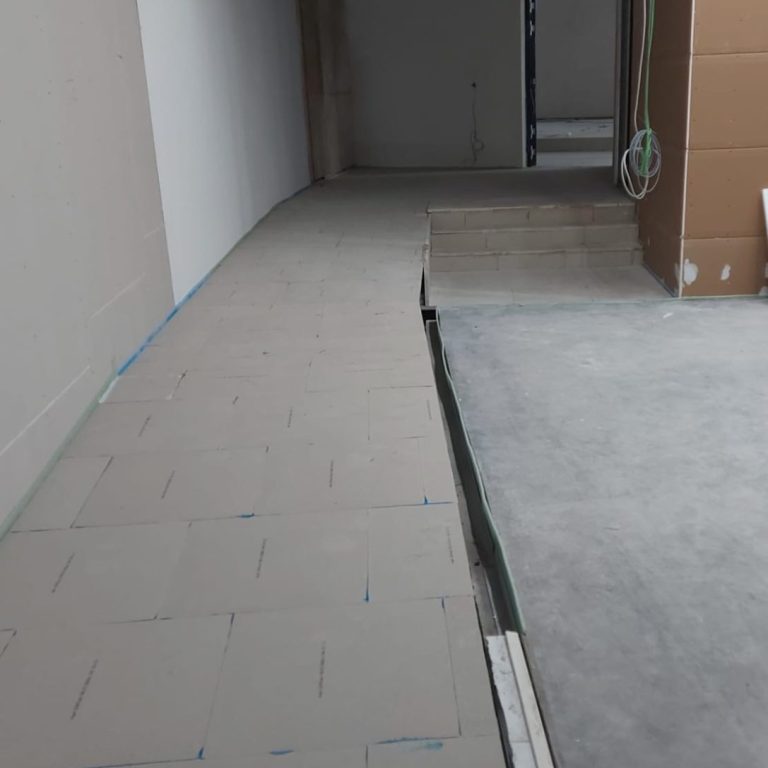 In einem Bürogebäude haben wir im Jahr 2025 zwei Rampen mit einem Podest dazwischen sowie eine Treppe als Nachunternehmer verlegt. Die beiden Rampen und das Podest wurden mit einer Schaltwartekonstruktion erbaut und mit Trockenboden verlegt.